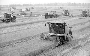 圖為聯(lián)合收割機(jī)在河南省唐河縣桐寨鋪鎮(zhèn)收割小麥 資料圖
