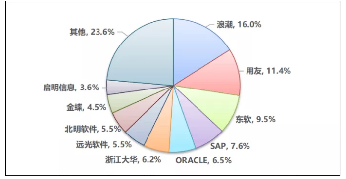 航天云網(wǎng)、石化盈科、用友、阿里、華為、樹根互聯(lián)、浪潮、寶信、紫光、海爾、東方國信等平臺起步較早,華能、北汽、浙江中控等行業(yè)領(lǐng)先企業(yè)也相繼推出了平臺產(chǎn)品。許多大型制造企業(yè)如徐工、TCL、中聯(lián)重科、富士康等剝離和整合內(nèi)部相關(guān)資源,成立了專門布局工業(yè)互聯(lián)網(wǎng)領(lǐng)域的獨立運營子公司。我國工業(yè)軟件市場份額分布如圖3所示。