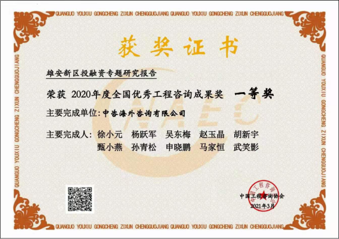 近日,在中國工程咨詢協會公布的“2020年度全國優(yōu)秀工程咨詢成果獎獲獎項目名單”中,中咨海外公司“雄安新區(qū)投融資專題研究報告”和“北京市永定河沿線資產調查及資金平衡方案”兩個咨詢成果分別榮獲全國優(yōu)秀工程咨詢成果一等獎!這是公司智庫建設成果的重大突破,是公司服務國家、履行職責擔當的重要體現!