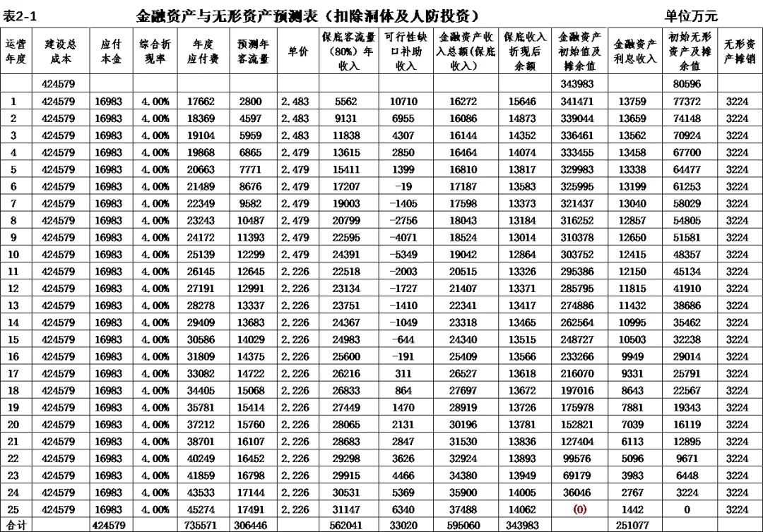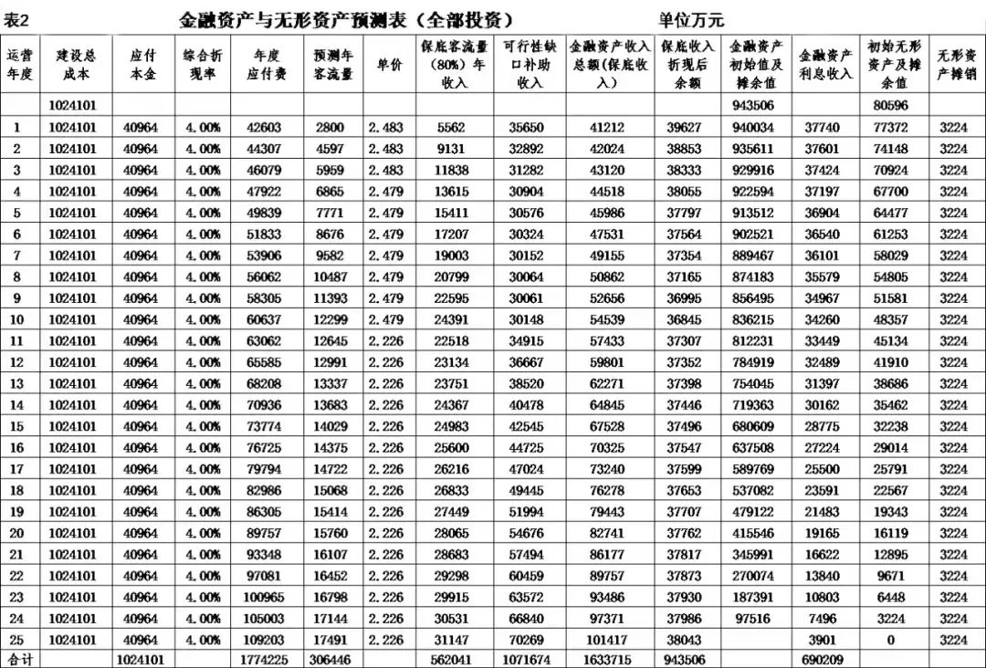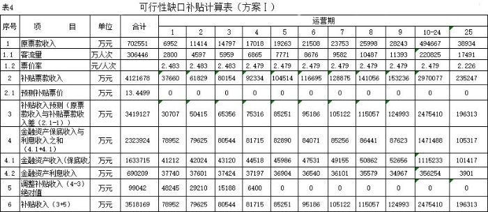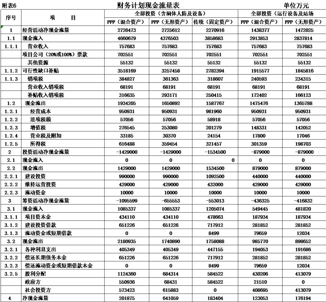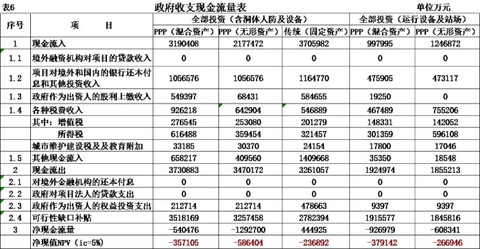式中,Ct為項(xiàng)目包括投資在內(nèi)的各期費(fèi)用,一般為財(cái)務(wù)分析的投資、經(jīng)營(yíng)成本估算及維持運(yùn)營(yíng)投資,Qt為第t期的產(chǎn)出供應(yīng)消費(fèi)的量,i0為折現(xiàn)率。 2.反推價(jià)格中費(fèi)用取值 反推價(jià)格公式中的費(fèi)用可以利用全部投資現(xiàn)金流量表或資本金現(xiàn)金流量表中的現(xiàn)金流出量。本文推薦在PPP項(xiàng)目中,采用資本金現(xiàn)金流量表中的現(xiàn)金流出計(jì)算反推價(jià)格,原因是資本金財(cái)務(wù)基準(zhǔn)收益率是投資者期望的目標(biāo)收益率,采用資本金現(xiàn)金流出量反推的價(jià)格,計(jì)算的補(bǔ)貼額可直接達(dá)到投資者期望的收益目標(biāo),同時(shí)也可滿(mǎn)足全部投資所得稅后財(cái)務(wù)內(nèi)部收益率指標(biāo)。 3.反推價(jià)格折現(xiàn)率取值 反推價(jià)格折現(xiàn)率取值可以適當(dāng)取值偏高一些,需要反復(fù)試算,選取合理折現(xiàn)率。 方案Ⅰ反推價(jià)格選取按折現(xiàn)率7%,計(jì)算結(jié)果,反推價(jià)格為13.4499元/人次,計(jì)算過(guò)程見(jiàn)表3。 4.可行性缺口補(bǔ)助計(jì)算過(guò)程 (1)反推價(jià)格(P=13.4499元/人.次); (2)利用反推價(jià)格和可研報(bào)告的產(chǎn)品(或服務(wù))數(shù)量計(jì)算達(dá)到目標(biāo)收益率的收入總量,見(jiàn)表3序號(hào)2,計(jì)算票款收入41.22億元(該項(xiàng)收入為原運(yùn)營(yíng)收入和需要補(bǔ)貼收入之和); (3)目標(biāo)收入總量減去原票款收入,計(jì)算需要補(bǔ)貼數(shù)額,見(jiàn)表3序號(hào)3,計(jì)算補(bǔ)貼收入(補(bǔ)貼票款收入與原票款收入之差(2.1-1.1))34.19億元; (4)計(jì)算金融資產(chǎn)保底收入與利息收入之和,見(jiàn)表3序號(hào)4(4.1+4.1)232.39億元; (5)調(diào)整補(bǔ)貼收入,當(dāng)有些年序中補(bǔ)貼票款收入與原票款收入之差小于零時(shí),需要調(diào)整補(bǔ)貼收入,令其補(bǔ)貼收入等于當(dāng)年的金融資產(chǎn)保底收入與利息收入之和,見(jiàn)表3序號(hào)5,9.9億元; (6)補(bǔ)貼收入,見(jiàn)表3序號(hào)6,351.82億元。 (三)財(cái)務(wù)分析指標(biāo)匯總 各方案可行性缺口補(bǔ)貼及評(píng)價(jià)指標(biāo)匯總見(jiàn)表5。 (四)政府收支現(xiàn)金流量分析 政府收支現(xiàn)金流量表見(jiàn)表6。 (五)五方案數(shù)據(jù)對(duì)比分析的兩點(diǎn)啟示 數(shù)據(jù)對(duì)比分析結(jié)果的啟示: 啟示一:采用PPP模式要合理界定項(xiàng)目的范圍?;A(chǔ)設(shè)施項(xiàng)目投資結(jié)構(gòu)中純公益性設(shè)施投資占有較大比重的項(xiàng)目不適宜將全部投資納入PPP模式,建議將純公益性設(shè)施與運(yùn)營(yíng)設(shè)施分開(kāi)處理,兩部分投資可選擇不同的運(yùn)作模式。 第一組案例,PPP模式方案Ⅰ和方案Ⅱ與政府自建的傳統(tǒng)模式方案Ⅲ相比: 方案Ⅰ和方案Ⅱ根據(jù)特許經(jīng)營(yíng)協(xié)議規(guī)定的績(jī)效考核標(biāo)準(zhǔn),兩方案投資、經(jīng)營(yíng)成本及更新改造投資均比傳統(tǒng)模式政府自建成本節(jié)約10%左右。表5財(cái)務(wù)指標(biāo)計(jì)算結(jié)果可行性缺口補(bǔ)貼,方案Ⅰ為351.82億元,方案Ⅱ?yàn)?25.75萬(wàn)元,方案Ⅲ為278.24億元。方案Ⅲ比方案Ⅰ節(jié)約73.43億元,比方案Ⅱ節(jié)約47.51億元。表6政府現(xiàn)金收支流量分析結(jié)果,方案Ⅲ政府收支凈現(xiàn)值(ic=5%)為最小-23.69億元,比方案Ⅰ-35.71億元,減少12.02億元, 比方案Ⅱ-58.64億元,減少34.95億元。 為什么傳統(tǒng)模式方案Ⅲ在投資規(guī)模、經(jīng)營(yíng)成本、更新改造投資均高出兩方案10%左右的情況下,而財(cái)務(wù)指標(biāo)優(yōu)于PPP模式?主要原因有兩個(gè): 一是,地鐵項(xiàng)目投資結(jié)構(gòu)分為兩部分,洞體工程為地鐵運(yùn)營(yíng)提供了運(yùn)輸空間,屬于純公益性質(zhì),且投資占比在60%左右,而投資占比40%左右的營(yíng)運(yùn)設(shè)施,則屬于經(jīng)營(yíng)性。在傳統(tǒng)項(xiàng)目實(shí)施方案中洞體及人防土建工程按80-100年提取折舊,在25年內(nèi)固定資產(chǎn)提取折舊57.89億元,回收固定資產(chǎn)余值54.93億元。而選擇PPP模式時(shí),洞體及人防建設(shè)成本在25年項(xiàng)目公司全部回收,顯然運(yùn)營(yíng)期增加了政府補(bǔ)貼額。 二是,政府自建模式方案Ⅲ,不存在對(duì)社會(huì)資本補(bǔ)貼收益的支出。政府自建模式的缺點(diǎn)是初始投資大,建設(shè)及運(yùn)營(yíng)風(fēng)險(xiǎn)全部由政府承擔(dān)。 啟示二:確認(rèn)PPP模式資產(chǎn)性質(zhì)、設(shè)置保底量及合理分擔(dān)政府與社會(huì)投資人的風(fēng)險(xiǎn),直接影響可行性缺口補(bǔ)貼的計(jì)算結(jié)果。 第一組案例是全部投資(含洞體及人防工程投資)條件下的PPP模式,方案Ⅰ為混合資產(chǎn),方案Ⅱ?yàn)闊o(wú)形資產(chǎn)(不再詳述)。 第二組案例扣除洞體及人防工程投資,方案Ⅳ混合資產(chǎn),方案Ⅴ無(wú)形資產(chǎn)。以下本文重點(diǎn)分析第二組方案PPP模式方案Ⅳ混合資產(chǎn)定性的過(guò)程。 方案Ⅳ和方案Ⅴ是扣除洞體及人防土建工程投資的PPP項(xiàng)目,項(xiàng)目總投資42.46億元,資本金18.79億元,政府出資5%,為0.93億元,社會(huì)出資人出資95%,為17.85億元。方案Ⅳ資產(chǎn)性質(zhì)為混合資產(chǎn),方案Ⅴ資產(chǎn)性質(zhì)為無(wú)