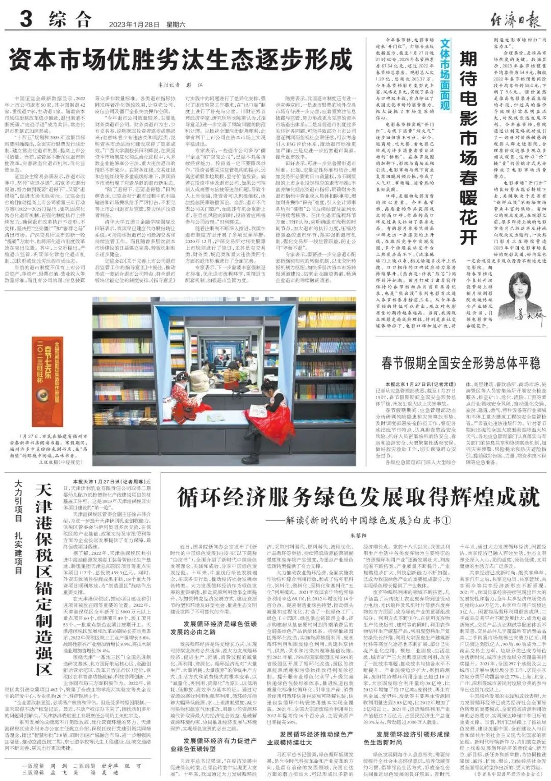 循環(huán)經(jīng)濟服務綠色發(fā)展取得輝煌成就 ——解讀《新時代的中國綠色發(fā)展》白皮書 朱黎陽 近日,國務院新聞辦公室發(fā)布了《新時代的中國綠色發(fā)展》白皮書(以下簡稱“白皮書”),全面介紹了新時代中國綠色發(fā)展理念、實踐和成效,分享中國綠色發(fā)展經(jīng)驗。十年來,中國踐行綠色發(fā)展理念,采取務實行動,推動經(jīng)濟社會發(fā)展綠色轉型。大力發(fā)展循環(huán)經(jīng)濟作為綠色發(fā)展的重要舉措,推動資源利用效率全面提升,為加快轉變經(jīng)濟發(fā)展方式、建設資源節(jié)約型和環(huán)境友好型社會、推進生態(tài)文明建設發(fā)揮了不可替代的作用。 01 發(fā)展循環(huán)經(jīng)濟是綠色低碳發(fā)展的必由之路 發(fā)展循環(huán)經(jīng)濟是轉變增長方式、實現(xiàn)可持續(xù)發(fā)展的必然選擇,要大力發(fā)展循環(huán)經(jīng)濟,促進生產(chǎn)、流通、消費過程的減量化、再利用、資源化。循環(huán)經(jīng)濟是對“大量生產(chǎn)、大量消耗、大量廢棄”的傳統(tǒng)生產(chǎn)方式、生活方式和消費模式的根本變革,以“減量化、再利用、資源化”為原則,以低消耗、低排放、高效率為基本特征。通過對資源的高效利用和循環(huán)利用,循環(huán)經(jīng)濟能夠大幅降低能源、水、土地消耗強度,減少污染物和溫室氣體排放,用最少的資源環(huán)境代價取得最大的經(jīng)濟社會效益,是破解資源環(huán)境約束、協(xié)同推進經(jīng)濟發(fā)展與環(huán)境保護、實現(xiàn)綠色發(fā)展的必由之路。 02 發(fā)展循環(huán)經(jīng)濟有力促進產(chǎn)業(yè)綠色低碳轉型 習近平總書記強調,“在經(jīng)濟發(fā)展中促進綠色轉型、在綠色轉型中實現(xiàn)更大發(fā)展”。十年來,我國通過大力發(fā)展循環(huán)經(jīng)濟,采取材料替代、燃料替代、流程優(yōu)化、產(chǎn)品循環(huán)等舉措,持續(xù)降低資源能源消耗強度和廢棄物產(chǎn)生強度,為重點產(chǎn)業(yè)綠色低碳轉型提供了有力支撐。 大力推動農業(yè)循環(huán)經(jīng)濟,全面實施農作物秸稈綜合利用行動,形成了秸稈肥料化、飼料化、燃料化、原料化和基料化“五化”利用模式。2021年我國農作物秸稈綜合利用率達88.1%,比2012年增長約14個百分點。促進制造業(yè)綠色轉型,推動源頭減量和過程優(yōu)化,打造了一批綠色工廠、綠色工業(yè)園區(qū)、綠色供應鏈管理企業(yè),逐步構建起從基礎原材料到終端消費品的全鏈條綠色產(chǎn)品供給體系。持續(xù)推進園區(qū)循環(huán)化改造,實施能源梯級利用、廢水循環(huán)利用和固廢綜合利用,共建共享供氣、供熱、供水和污染治理等基礎設施。到2021年底,75%的國家級園區(qū)和50%的省級園區(qū)開展了循環(huán)化改造,園區(qū)的資源能源消耗和污染物排放得到有效控制。提升服務業(yè)綠色化水平,升級完善快遞綠色包裝標準體系,推進快遞包裝減量化、標準化、循環(huán)化,引導生產(chǎn)商、消費者使用可循環(huán)快遞包裝和可降解包裝,快遞包裝循環(huán)中轉袋使用基本實現(xiàn)全覆蓋。2021年,全國大宗固廢綜合利用率比2012年提高約16個百分點,主要資源產(chǎn)出率提高58%。 03 發(fā)展循環(huán)經(jīng)濟推動綠色產(chǎn)業(yè)規(guī)模持續(xù)壯大 習近平總書記強調,綠色循環(huán)低碳發(fā)展,是當今時代科技革命和產(chǎn)業(yè)變革的方向,是最有前途的發(fā)展領域,我國在這方面的潛力相當大,可以形成很多新的經(jīng)濟增長點。黨的十八大以來,我國以利用生產(chǎn)生活中各類廢棄物為主要特征的“資源循環(huán)利用產(chǎn)業(yè)”逐漸發(fā)展壯大,利廢范圍不斷拓寬、產(chǎn)業(yè)質量不斷提升、產(chǎn)業(yè)規(guī)模穩(wěn)步擴大、科技創(chuàng)新能力不斷加強,已成為我國綠色產(chǎn)業(yè)的重要組成部分,為實現(xiàn)綠色增長提供了產(chǎn)業(yè)載體。 廢棄物循環(huán)利用的領域不斷拓寬,幾乎涵蓋了從傳統(tǒng)工農業(yè)廢棄物到退役動力電池、光伏組件及風機葉片等新興廢棄物的方方面面,成為綠色產(chǎn)業(yè)的重要組成部分。利用方式不斷優(yōu)化,在使用廢棄物生產(chǎn)傳統(tǒng)板材、建材等的同時,利用農作物秸稈生產(chǎn)碳基產(chǎn)品,利用廢塑料生產(chǎn)復紡滌綸長纖維,利用大宗固廢生產(chǎn)建筑新材料等高值化途徑也不斷擴展,部分已實現(xiàn)產(chǎn)業(yè)化應用。聚焦工業(yè)固廢、生活垃圾、城市礦產(chǎn)三大類典型固廢利用,攻克了一批技術難題,推動技術與裝備水平不斷提升。產(chǎn)業(yè)規(guī)模穩(wěn)步擴大,據(jù)粗略測算,廢舊物資循環(huán)利用企業(yè)已超過10萬家,大宗固廢綜合利用量約38億噸,比2012年增加了約17億噸;廢鋼鐵、再生有色金屬、廢塑料、廢紙等主要再生資源回收利用量達到3.85億噸,比2012年增加了2億噸以上。2021年,資源循環(huán)利用產(chǎn)業(yè)產(chǎn)值超過3萬億元,占國民生產(chǎn)總值的3%左右,帶動超過3000萬人就業(yè)。 04 發(fā)展循環(huán)經(jīng)濟引領形成綠色生活新時尚 綠色發(fā)展同每個人息息相關,需要持續(xù)提升全社會生態(tài)環(huán)保意識,培養(yǎng)低碳節(jié)約習慣,倡導綠色生活方式,形成全社會共同推進綠色發(fā)展的良好氛圍。新時代十年來,