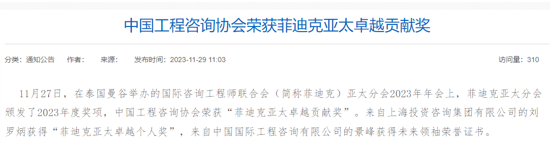 2023年,國際咨詢工程師聯(lián)合會(簡稱菲迪克)喜訊頻傳。中咨公司繼“金沙江白鶴灘水電站”榮獲菲迪克2023年度卓越工程項目獎、“福建福清核電5、6號機組”榮獲優(yōu)秀工程項目獎,在11月27日泰國曼谷舉辦的菲迪克亞太分會2023年年會上,中咨公司員工景峰榮獲菲迪克亞太未來領(lǐng)袖榮譽稱號。這也是經(jīng)公司推薦獲得的首個工程師獎項。