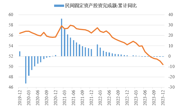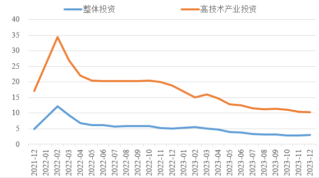 2023年,面對世界經(jīng)濟復(fù)蘇乏力、國內(nèi)自然災(zāi)害頻發(fā)、改革發(fā)展穩(wěn)定任務(wù)艱巨等多重挑戰(zhàn),我國經(jīng)濟回升向好,經(jīng)濟轉(zhuǎn)型升級深入推進。投資對優(yōu)化供給結(jié)構(gòu)的關(guān)鍵作用更加凸顯,制造業(yè)投資持續(xù)向好,高技術(shù)產(chǎn)業(yè)投資占比穩(wěn)步提高。同時,房地產(chǎn)投資仍未見底、民營經(jīng)濟發(fā)展面臨較大壓力、地方政府債務(wù)擴展及外溢風(fēng)險等突出問題制約投資持續(xù)穩(wěn)定增長。做好2024年投資促進工作,需積極擴大有效益的投資,多舉措激發(fā)民間投資內(nèi)生動力,全力穩(wěn)定房地產(chǎn)投資預(yù)期,適度增加地方政府專項債券規(guī)模,加大重點領(lǐng)域補短板投資。 一、2023年整體投資增速有所放緩 2023年,我國固定資產(chǎn)投資(不含農(nóng)戶)同比增長3%,增速較上年下降2.1個百分點,較前三季度、上半年、一季度分別下降0.1個、0.8個、2.1個百分點,固定資產(chǎn)投資增速逐季放緩。1—11月,建安工程、設(shè)備工器具購置、其他費用分別增長2.1%、6.7%、3.1%,建安工程投資增速明顯低于設(shè)備工器具購置投資增速,說明房屋、建筑物和設(shè)備裝置安裝等投資的活躍程度有所下降,體現(xiàn)技術(shù)水平的設(shè)備工器具投入增長加快。 圖1 全國固定資產(chǎn)投資增速(%) 數(shù)據(jù)來源:國家統(tǒng)計局 (一)民間投資動力不足。2023年,新冠疫情防控平穩(wěn)轉(zhuǎn)段,疫情產(chǎn)生的“疤痕效應(yīng)”仍待消除,需求收縮、供給沖擊、預(yù)期轉(zhuǎn)弱三重壓力尚在,民營企業(yè)面臨市場競爭加劇、利潤率下降、轉(zhuǎn)型升級難度增大、融資難融資貴等突出困難。全年民間固定資產(chǎn)投資253544億元,同比下降0.4%,較上年低了1.3個百分點,低于投資整體增速3.4個百分點。截至2023年12月底,我國民間固定資產(chǎn)投資已連續(xù)8個月負增長,民間固定資產(chǎn)投資占比連續(xù)7個月下降,跌至2011年以來的最低點,僅為50.4%,民間投資信心有待進一步提振。 圖2 民間投資增速及占比(%) 數(shù)據(jù)來源:國家統(tǒng)計局,Wind數(shù)據(jù)庫 (二)制造業(yè)投資保持較高韌性,房地產(chǎn)投資持續(xù)低迷。在中央預(yù)算內(nèi)投資、地方政府專項債等資金的引導(dǎo)帶動下,基礎(chǔ)設(shè)施和制造業(yè)投資支撐作用更加顯著。2023年,中咨公司累計運行項目8421項,其中基礎(chǔ)設(shè)施投資與制造業(yè)投資項目占比近8成。我國計劃總投資億元及以上項目投資同比增長9.3%,拉動全部投資增長4.8個百分點,大項目投資帶動作用明顯。2023年,基礎(chǔ)設(shè)施投資同比增長8.24%,高于整體投資5.24個百分點,較2019年高了4.91個百分點。其中,鐵路運輸業(yè)投資、水利管理業(yè)投資分別增長25.2%、5.2%。制造業(yè)投資同比增長6.5%,高于整體投資增速3.5個百分點,較2019年高了3.4個百分點。制造業(yè)投資仍保持較高韌性,傳統(tǒng)產(chǎn)業(yè)高端化綠色化智能化轉(zhuǎn)型加快,電氣機械和器材制造業(yè)、汽車制造業(yè)投資分別增長32.2%、19.4%。 表1 1—12月我國各行業(yè)固定資產(chǎn)投資情況 數(shù)據(jù)來源:國家統(tǒng)計局,Wind數(shù)據(jù)庫 2023年,房地產(chǎn)開發(fā)投資增速持續(xù)放緩,房地產(chǎn)開發(fā)投資、住宅開發(fā)投資分別同比下降9.6%、9.3%。房地產(chǎn)開發(fā)投資占固定資產(chǎn)投資完成額的比重降至22%,較上年下降1.2個百分點,為3年以來最低值。房屋施工面積、房屋新開工面積等先行指標(biāo)均出現(xiàn)明顯下滑,分別同比下降7.2%、20.4%。1—12月,國房景氣指數(shù)均位于100以下,自4月以來持續(xù)走低。 圖3 三大領(lǐng)域固定資產(chǎn)投資增速(累計同比,%) 數(shù)據(jù)來源:國家統(tǒng)計局,Wind數(shù)據(jù)庫 高技術(shù)產(chǎn)業(yè)投資引領(lǐng)帶動作用持續(xù)增強,集成電路、高端芯片、儀器儀表設(shè)備等領(lǐng)域關(guān)鍵核心技術(shù)攻關(guān)扎實推進,新能源、人工智能、生物醫(yī)藥等新興產(chǎn)業(yè)發(fā)展加快。2023年我國高技術(shù)產(chǎn)業(yè)投資增長10.3%,穩(wěn)投資引領(lǐng)作用持續(xù)顯現(xiàn)。高技術(shù)制造業(yè)投資比上年增長9.9%,增速比制造業(yè)投資高3.4個百分點。其中,航空、航天器及設(shè)備制造業(yè),計算機及辦公設(shè)備制造業(yè),電子及通信設(shè)備制造業(yè)投資分別增長18.4%、14.5%、11.1%。高技術(shù)服務(wù)業(yè)投資比上年增長11.4%,增速比服務(wù)業(yè)投資高11個百分點。其中,科技成果轉(zhuǎn)化服務(wù)業(yè)、電子商務(wù)服務(wù)業(yè)投資分別增長31.8%、29.2%。高技術(shù)產(chǎn)業(yè)引資能力不斷增強,1—11月高技術(shù)產(chǎn)業(yè)引資3866.5億元人民幣,占全國實際使用外資總額的37.2%,較2022年全年提升1.1個百分點。 圖4 高技術(shù)產(chǎn)業(yè)投資增速對比整體投資增速(累計同比,%) 數(shù)據(jù)來源:國家統(tǒng)計局,Wind數(shù)據(jù)庫 (三)東部地區(qū)投資保持較快增長,東北地區(qū)投資延續(xù)負增長。今年以來,中咨公司承接31個省市委托的項目中,東部、中部、西部和東北地區(qū)占比分別為43%、16%、36%、5%。2023年,我國東部地區(qū)投資同比增長4.4%,較全國水平高了1.4個百分點;中部、西部地區(qū)投資