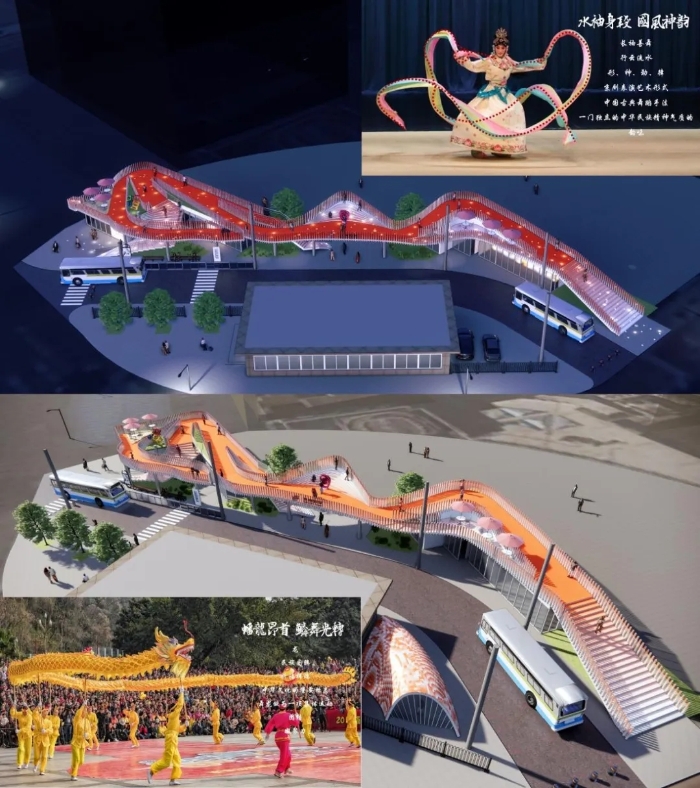 城市區(qū)位上,場(chǎng)站內(nèi)外的現(xiàn)有屏障墻全部拆除向市民開(kāi)放,成為聯(lián)結(jié)北側(cè)高層建筑前廣場(chǎng)與地鐵站口的紐帶與橋梁。兩側(cè)站務(wù)用房之間及候車站臺(tái)區(qū)通過(guò)增設(shè)立柱,架起契合用地紅線的二層廊橋相連通,開(kāi)敞的下方供行人穿行。整體形象猶如節(jié)日慶典上舞龍桿揮舞蜿蜒盤旋的金色蟠龍,意喻團(tuán)結(jié)、統(tǒng)籌起周邊的地鐵、高層廣場(chǎng),凝聚人氣上“龍背”。通過(guò)場(chǎng)站—城市一體化設(shè)計(jì),既順應(yīng)空間共融服務(wù)共享理念,提升整體效益,也縮短了換乘距離。