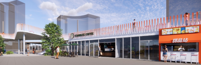 原場(chǎng)站服務(wù)用房貼臨的北側(cè)屏蔽圍墻是商業(yè)及便民服務(wù)的主要制約條件。通過(guò)屏蔽墻的拆除,使得整個(gè)場(chǎng)站北側(cè)界面以開(kāi)放姿態(tài)面向身后高層建筑前廣場(chǎng)。服務(wù)功能用房?jī)?yōu)化整合集中在場(chǎng)站東側(cè),通過(guò)將更貼臨高層建筑前廣場(chǎng)的西側(cè)場(chǎng)站房屋的界面進(jìn)行通透化的處理,增加便民服務(wù)商業(yè)網(wǎng)點(diǎn),貼紅線開(kāi)啟的服務(wù)窗口直接面向廣場(chǎng)人流,進(jìn)一步增強(qiáng)地塊之間的開(kāi)放、融合與共享,重新激發(fā)城市應(yīng)有的活力。