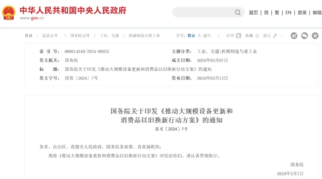 近日,國務(wù)院印發(fā)《推動大規(guī)模設(shè)備更新和消費品以舊換新行動方案》(國發(fā)〔2024〕7號,以下簡稱7號文),重點實施設(shè)備更新、消費品“以舊換新”、回收循環(huán)利用、標(biāo)準(zhǔn)提升四大行動,并明確提出加大財政政策支持力度和優(yōu)化金融支持,為大規(guī)模設(shè)備更新和消費品“以舊換新”提供堅實有效的政策保障。 習(xí)近平總書記在主持召開中央財經(jīng)委員會第四次會議時強調(diào),加快產(chǎn)品更新?lián)Q代是推動高質(zhì)量發(fā)展的重要舉措,將有力促進(jìn)投資和消費,既利當(dāng)前、更利長遠(yuǎn)。 產(chǎn)品更新?lián)Q代促進(jìn)的是有效投資, 激發(fā)的是綠色消費 當(dāng)前,我國經(jīng)濟(jì)持續(xù)回升向好的基礎(chǔ)還不穩(wěn)固,突出矛盾是有效需求不足,企業(yè)投資和居民消費的意愿不強。推動大規(guī)模設(shè)備更新,是將擴(kuò)大內(nèi)需和深化供給側(cè)結(jié)構(gòu)性改革有機結(jié)合起來的具體體現(xiàn)。通過政策激勵,引導(dǎo)企業(yè)加大投資,對不符合能耗、環(huán)保、安全生產(chǎn)等最低標(biāo)準(zhǔn)的生產(chǎn)設(shè)備進(jìn)行淘汰更新,對運行效率較低的“啞設(shè)備”進(jìn)行數(shù)字化、智能化更新升級,進(jìn)一步提升技術(shù)工藝水平,為消費者提供更加優(yōu)質(zhì)、綠色、智能的產(chǎn)品,對企業(yè)來說可以提高生產(chǎn)效率和產(chǎn)品質(zhì)量,對國家來說可以拉動有效投資,為經(jīng)濟(jì)增長提供強勁支撐。 同時,近年來受諸多不利因素影響,很多家用汽車、家電、家具等大件消費品更換頻率較低,消費品更新?lián)Q代需求有提升潛力。新一輪消費品“以舊換新”,將以綠色、智能、安全消費品更新升級為重點,促進(jìn)與居民生活密切相關(guān)消費品從“有沒有”轉(zhuǎn)向“好不好”,加快淘汰符合強制報廢標(biāo)準(zhǔn)和具有安全隱患的“超期服役”產(chǎn)品,如淘汰國三以及以下排放標(biāo)準(zhǔn)或車齡15年以上的乘用車,以及超過安全使用年限標(biāo)準(zhǔn)的家電產(chǎn)品??梢哉f,這輪政策實施不僅有利于提高居民生活品質(zhì),而且將有效拓展新的綠色低碳消費空間,培育新型消費,充分激發(fā)市場對高端產(chǎn)品和服務(wù)的潛在需求。 以新質(zhì)生產(chǎn)力為引領(lǐng)助推產(chǎn)業(yè)升級 2024年1月31日,習(xí)近平總書記在中共中央政治局第十一次集體學(xué)習(xí)時強調(diào),新質(zhì)生產(chǎn)力就是創(chuàng)新起主導(dǎo)作用、擺脫傳統(tǒng)經(jīng)濟(jì)增長方式、生產(chǎn)力發(fā)展路徑,具有高科技、高質(zhì)量、高效能特征,符合新發(fā)展理念的先進(jìn)生產(chǎn)力質(zhì)態(tài)。產(chǎn)品更新?lián)Q代的實質(zhì)就是先進(jìn)替代落后,7號文提出以工業(yè)、建筑、農(nóng)業(yè)、交通、教育、文旅、醫(yī)療等七大領(lǐng)域為重點,以產(chǎn)品更新和設(shè)備升級帶動我國產(chǎn)業(yè)高端化、智能化、綠色化發(fā)展,提升安全可靠水平,為發(fā)展新質(zhì)生產(chǎn)力創(chuàng)造良好的市場環(huán)境。 據(jù)測算,我國超過20%在運的用能設(shè)備未能達(dá)到最低能耗限額標(biāo)準(zhǔn),設(shè)備更新以堅持鼓勵先進(jìn)、淘汰落后為原則,推廣應(yīng)用能效達(dá)到先進(jìn)水平和節(jié)能水平的用能設(shè)備,可以有效降低生產(chǎn)過程中的能耗和碳排放。推廣應(yīng)用智能制造設(shè)備和軟件,培育數(shù)字經(jīng)濟(jì)賦智賦能新模式,可以提高生產(chǎn)線的數(shù)字化、智能化程度,優(yōu)化工藝流程,減少人工操作失誤,提高生產(chǎn)效率和質(zhì)量,推動先進(jìn)產(chǎn)能比重持續(xù)提升。 “換新+回收”,促進(jìn)資源循環(huán)利用 大規(guī)模設(shè)備更新和消費品“以舊換新”必將帶來大量老舊設(shè)備和產(chǎn)品的回收循環(huán)利用問題,對“退役”設(shè)備和各類廢棄產(chǎn)品進(jìn)行妥善處置和循環(huán)利用是大規(guī)模設(shè)備更新和消費品“以舊換新”順利實施的重要保障。7號文將回收循環(huán)利用行動作為四大行動之一,推行“換新+回收”模式,對于促進(jìn)資源循環(huán)利用、提高經(jīng)濟(jì)循環(huán)質(zhì)量和水平具有重要意義。 實施好回收循環(huán)利用行動,關(guān)鍵要堅持產(chǎn)品全生命周期理念,形成產(chǎn)品從設(shè)計研發(fā)到回收利用的良性循環(huán)。要大力推行產(chǎn)品和設(shè)備的生態(tài)設(shè)計,使廢舊產(chǎn)品和設(shè)備易拆解、易回收。要加快完善廢舊產(chǎn)品和設(shè)備回收體系,積極構(gòu)建“換新+回收”新模式,引導(dǎo)二手車和二手電子產(chǎn)品市場便利化、規(guī)范化發(fā)展,促進(jìn)汽車零部件、工程機械、機床等廢舊生產(chǎn)設(shè)備再制造,鼓勵風(fēng)電光伏、動力電池等產(chǎn)品設(shè)備及關(guān)鍵部件梯次利用,有效提高廢舊產(chǎn)品設(shè)備中廢鋼鐵、廢有色金屬、廢塑料等各類材料的資源再生效率,為二手商品交易、再制造、資源再生利用等循環(huán)利用產(chǎn)業(yè)發(fā)展創(chuàng)造廣闊的市場空間。同時,要進(jìn)一步提升再生材料在原材料供給中的占比,降低戰(zhàn)略性原生資源的進(jìn)口依賴。 財政和金融政策是激發(fā)企業(yè) 加快