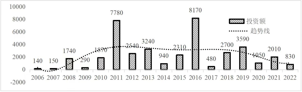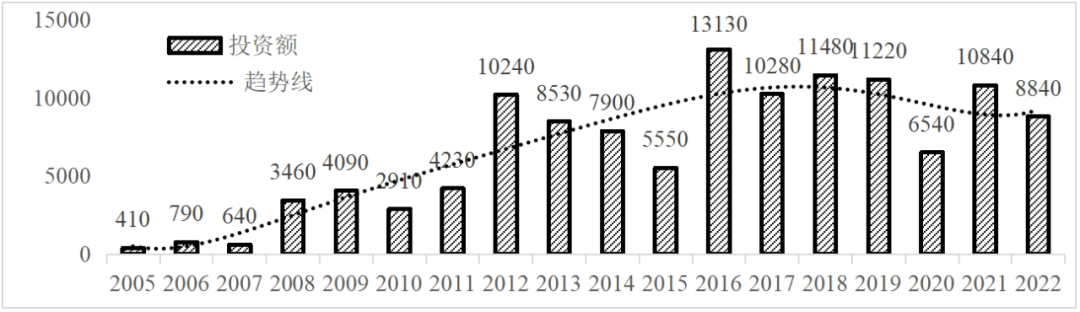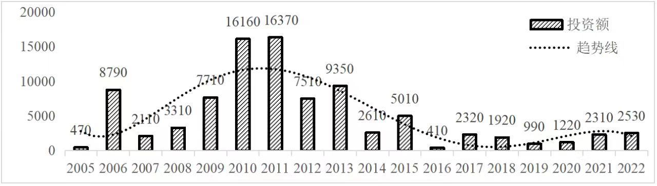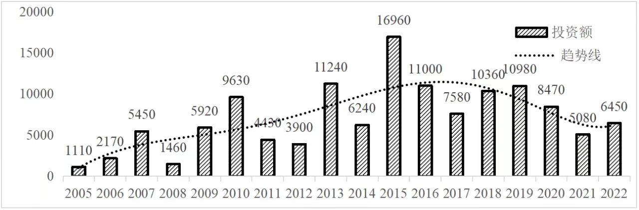 企業(yè)境外投資研究之二: 中央企業(yè)境外投資情況 楊凱越 編者按:根據(jù)商務(wù)部2023年10月發(fā)布的我國(guó)對(duì)外直接投資統(tǒng)計(jì)數(shù)據(jù),截至2022年,我國(guó)對(duì)外直接投資存量達(dá)27548.1億美元,當(dāng)年對(duì)外直接投資規(guī)模達(dá)1631.2億美元,居世界第二位。截至2022年底,中國(guó)2.9萬(wàn)家境內(nèi)投資者共設(shè)立境外企業(yè)4.66萬(wàn)家,分布在全球190個(gè)國(guó)家(地區(qū)),年末境外企業(yè)資產(chǎn)總額8.4萬(wàn)億美元。隨著“雙循環(huán)”戰(zhàn)略、“走出去”戰(zhàn)略和“一帶一路”倡議的深入推進(jìn)實(shí)施,對(duì)企業(yè)境外投資開(kāi)展系統(tǒng)研究,探索如何更高質(zhì)量地開(kāi)展境外投資,成為當(dāng)前一項(xiàng)重要和緊迫的任務(wù)。本公眾號(hào)將企業(yè)境外投資研究成果以系列文章的形式陸續(xù)刊發(fā),本文是研究報(bào)告的第二部分,供業(yè)界同仁參考。 一、總體情況 中央企業(yè)2013-2019年境外投資年均增速約15%,營(yíng)業(yè)收入增速保持在約4.5%。根據(jù)國(guó)務(wù)院國(guó)資委和社科院聯(lián)合發(fā)布的《中央企業(yè)海外社會(huì)責(zé)任藍(lán)皮書(shū)(2020)》,中央企業(yè)在境外投資發(fā)展時(shí),7%投資第一產(chǎn)業(yè),69%參與第二產(chǎn)業(yè),40%發(fā)展第三產(chǎn)業(yè)。截至2019年底,中央企業(yè)境外資產(chǎn)總額8.1萬(wàn)億元、所有者權(quán)益2.3萬(wàn)億元。其中,81家中央企業(yè)在“一帶一路”沿線承擔(dān)項(xiàng)目數(shù)量逾3400個(gè)。中央企業(yè)承擔(dān)“一帶一路”基礎(chǔ)設(shè)施項(xiàng)目數(shù)比率超過(guò)60%,合同投資額超過(guò)80%。 近年來(lái),中央企業(yè)境外投資及運(yùn)營(yíng)總體仍呈現(xiàn)較為平穩(wěn)的態(tài)勢(shì)。中央企業(yè)2013-2020年境外營(yíng)業(yè)收入總規(guī)模逾24萬(wàn)億元,利潤(rùn)總規(guī)模約6000億元。2021年,中央企業(yè)和單位對(duì)外非金融類(lèi)直接投資642.9億美元,占我國(guó)對(duì)外直接投資比重約36.0%,同比增長(zhǎng)30.7%,逾60%來(lái)自收益再投資。根據(jù)國(guó)務(wù)院國(guó)資委《中央企業(yè)海外發(fā)展報(bào)告(2023)》,截至2022年底,中央企業(yè)境外投資機(jī)構(gòu)和項(xiàng)目逾8000個(gè),境外員工125萬(wàn)人,境外資產(chǎn)總額近8萬(wàn)億元(比2019年略有下降),當(dāng)年境外投資規(guī)模3739億元。 表1 中央企業(yè)境外投資規(guī)模 單位:億美元 數(shù)據(jù)來(lái)源:商務(wù)部2016-2021年度中國(guó)對(duì)外直接投資統(tǒng)計(jì)公報(bào)。 本文根據(jù)中國(guó)全球投資追蹤(China Global Investment Tracker,CGIT)數(shù)據(jù)庫(kù),按照國(guó)務(wù)院國(guó)資委2023年中央企業(yè)名錄,對(duì)我國(guó)中央企業(yè)境外投資情況進(jìn)行了整理。因數(shù)據(jù)口徑不同,中央企業(yè)境外投資規(guī)模與前述商務(wù)部統(tǒng)計(jì)數(shù)據(jù)有所差異。根據(jù)CGIT數(shù)據(jù),中央企業(yè)境外投資在2013年達(dá)到峰值858.7億美元,此后呈下降趨勢(shì),2022年境外投資規(guī)模僅180.3億美元。 數(shù)據(jù)來(lái)源:CGIT數(shù)據(jù)庫(kù),作者整理。 圖1 2005-2022年中央企業(yè)境外投資規(guī)模 單位:億美元 根據(jù)CGIT數(shù)據(jù)庫(kù),中央企業(yè)2005-2022年各行業(yè)境外投資情況見(jiàn)圖2。其中,能源類(lèi)境外投資規(guī)模最高,為4460.1億美元;建筑工程類(lèi)(包括鐵路、公路等交通基礎(chǔ)設(shè)施建設(shè)類(lèi))境外投資規(guī)模其次,為1534億美元;金屬類(lèi)(含礦產(chǎn))境外投資排名第三為972.5億美元;公用事業(yè)類(lèi)境外投資規(guī)模第四,為702.5億美元;此外,中央企業(yè)境外投資涉及領(lǐng)域還包括旅游、健康、金融、科技、農(nóng)業(yè)、化工、物流、娛樂(lè)等。2018-2022年各行業(yè)境外投資情況見(jiàn)圖3。 數(shù)據(jù)來(lái)源:CGIT數(shù)據(jù)庫(kù),作者整理。 圖2 2005-2022年中央企業(yè)分行業(yè)境外投資規(guī)模 單位:億美元 數(shù)據(jù)來(lái)源:CGIT數(shù)據(jù)庫(kù),作者整理。 圖3 2018-2022年中央企業(yè)分行業(yè)境外投資規(guī)模 單位:百萬(wàn)美元 二、分行業(yè)情況 本文對(duì)2005年1月-2022年12月我國(guó)中央企業(yè)境外投資選取能源行業(yè)、建筑工程行業(yè)、金屬行業(yè)、公用事業(yè)、旅游業(yè)等投資規(guī)模位居前列的行業(yè),分行業(yè)情況進(jìn)行了整理。 (一)能源行業(yè) 2005-2022年中央企業(yè)能源行業(yè)境外投資情況見(jiàn)圖4。分析發(fā)現(xiàn),我國(guó)中央企業(yè)能源行業(yè)境外投資在2010年達(dá)到峰值后呈逐年下降的趨勢(shì)。 數(shù)據(jù)來(lái)源:CGIT數(shù)據(jù)庫(kù),作者整理。 圖4 能源行業(yè)2005-2022年中央企業(yè)境外投資規(guī)模 單位:億美元 (二)建筑工程行業(yè) 2005-2022年中央企業(yè)建筑工程行業(yè)境外投資情況見(jiàn)圖5。分析發(fā)現(xiàn),建筑工程行業(yè)境外投資在2009年達(dá)到峰值,此后呈逐年下降。 數(shù)據(jù)來(lái)源:CGIT數(shù)據(jù)庫(kù),作者整理。 圖5 建筑工程行業(yè)2005-2022年中央企業(yè)境外投資規(guī)模 單位:億美元 (三)金屬行業(yè) 2005-2022年中央企業(yè)金屬行業(yè)境外投資情況見(jiàn)圖6