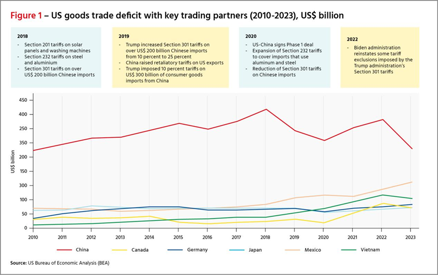 摘要 8月13日,辛里奇基金會貿(mào)易政策主管黛博拉·埃爾姆斯發(fā)表文章《特朗普如何塑造21世紀(jì)美國貿(mào)易政策》。文章指出,特朗普第一個任期以貿(mào)易為主導(dǎo),主要是將美國的國家和安全利益置于前沿和中心位置,將貿(mào)易作為美國外交和戰(zhàn)略政策的武器,但現(xiàn)在已“根植”在華盛頓兩黨、兩院和長期政策制定中。因此,在評估美國貿(mào)易和經(jīng)濟政策制定方式的急劇轉(zhuǎn)變時,有五點轉(zhuǎn)變值得注意,其始于特朗普政府時期,并在拜登政府時期延續(xù)。 正文 隨著即將到來的美國總統(tǒng)選舉的民調(diào)結(jié)果愈發(fā)緊張,貿(mào)易觀察人士正密切關(guān)注唐納德·特朗普總統(tǒng)第一任期的經(jīng)驗教訓(xùn)以及他重返白宮的計劃。特朗普代表著與過去美國貿(mào)易政策做法的徹底決裂,但他對國內(nèi)普遍情緒的利用程度足夠深,以至于他的許多政策在拜登總統(tǒng)任期內(nèi)得以延續(xù),而且無論誰入主白宮,他的政策似乎都將繼續(xù)下去。 貿(mào)易和經(jīng)濟是特朗普議程的核心。多年來,他對許多其他議題的立場發(fā)生了變化,但他始終專注于貿(mào)易。這是他擔(dān)任總統(tǒng)之前就存在的一個目標(biāo)。1987年,他在《紐約時報》上刊登了一整頁廣告,抗議當(dāng)時他認(rèn)為不公平的貿(mào)易行為,尤其是日本的貿(mào)易行為,他認(rèn)為這種行為削弱了美國。這已經(jīng)預(yù)示了他后來擔(dān)任總統(tǒng)時將采取的提高關(guān)稅的舉措。 特朗普就任總統(tǒng)后,貿(mào)易政策成為“特朗普政策指南針的四個要點”之一。事實證明,這一貿(mào)易指南針非常耐用,他和他的團隊對美國政策做出的許多改變在他離開白宮后仍然有效。特朗普政府為重新定位美國長期政策制定而采取的立場現(xiàn)在似乎已“根植”在華盛頓的決策中。 在評估美國貿(mào)易和經(jīng)濟政策制定方式的急劇轉(zhuǎn)變時,有幾點值得注意,這種轉(zhuǎn)變始于特朗普時期,并在拜登時期基本延續(xù)。這些包括 1.推動白宮和行政部門的貿(mào)易政策; 2.重新使用單邊貿(mào)易工具; 3.重新制定貿(mào)易政策以適應(yīng)經(jīng)濟戰(zhàn); 4.與經(jīng)濟盟友的關(guān)系發(fā)生變化; 5.貿(mào)易利益與國家安全利益相混淆; 6.全球貿(mào)易體系多邊規(guī)則制定削弱。 特朗普在實施貿(mào)易議程方面之所以有效,得益于美國政治制度的特殊性。盡管美國憲法明確賦予國會管理稅收(以及關(guān)稅)的權(quán)力,但美國總統(tǒng)和行政部門在貿(mào)易和經(jīng)濟問題上仍有很大的回旋余地。自2017年1月,特朗普上任第一天單方面宣布退出跨太平洋伙伴關(guān)系協(xié)定(TPP)以來,美國貿(mào)易政策在很大程度上是由白宮推動的,國會對此沒有施加太大壓力。 在拜登政府的領(lǐng)導(dǎo)下,貿(mào)易政策繼續(xù)由行政部門制定。拜登和特朗普一樣,繞過國會就貿(mào)易和經(jīng)濟問題發(fā)布了一系列行政命令。他進一步將貿(mào)易政策制定權(quán)集中在白宮,而美國貿(mào)易代表辦公室(USTR)的作用則大大受限。美國商務(wù)部在印太經(jīng)濟繁榮框架(IPEF)中發(fā)揮了核心作用,該框架要求調(diào)整美國國內(nèi)政策流程,以允許美國商務(wù)部參與國際談判。 其次,特朗普選擇了里根政府的貿(mào)易律師兼高級貿(mào)易官員羅伯特·萊特希澤擔(dān)任美國貿(mào)易代表,萊特希澤對美國政治和政策制定體系有著豐富的知識和經(jīng)驗。萊特希澤與彼得·納瓦羅和威爾伯·羅斯等其他顧問一起制定了許多美國法規(guī)和政策,這些法規(guī)和政策在很大程度上已經(jīng)擱置了數(shù)年甚至數(shù)十年。萊特希澤被任命為美國貿(mào)易代表后,得以重啟國內(nèi)工具,例如有關(guān)不公平貿(mào)易行為的第301條款或有關(guān)國家安全的第232條款。 同樣,拜登政府繼續(xù)使用了許多這些具體的工具。對鋼鐵和鋁征收的232條款關(guān)稅仍然有效,對中國產(chǎn)品的301條款關(guān)稅也是如此。拜登于2024年7月20日通過公告宣布了新的鋼鐵232條款申請。2024年8月,還對一組新的中國產(chǎn)品征收了301條款關(guān)稅。 特朗普最初貿(mào)易議程的第三個重要領(lǐng)域是對貿(mào)易政策目的的重大重新評估。301條款或232條款等工具被用來實現(xiàn)其目標(biāo),其根源在于美國正在經(jīng)歷一場經(jīng)濟戰(zhàn)。特朗普的論點被萊特希澤巧妙運用和實施,他認(rèn)為過去的做法尤其是貿(mào)易協(xié)定的使用以及他們認(rèn)為過去政府未能妥善執(zhí)行這些協(xié)定的做法,加速了美國的衰落。 雖然拜登執(zhí)政期間大部分政策調(diào)整都得以實施,但特朗普的一項關(guān)鍵指標(biāo)被取消了。特朗普將雙邊貿(mào)易逆差的規(guī)模視為衡量美國是否從貿(mào)易中獲益的標(biāo)準(zhǔn)。與美國存在大量商品貿(mào)易逆差的國家被認(rèn)為采用了不恰當(dāng)?shù)馁Q(mào)易做法。 圖1和圖2顯示,盡管特朗普重新調(diào)整貿(mào)易政策并重點關(guān)注雙邊貿(mào)易逆差,但除非疫情扭曲趨勢,否則美國貿(mào)易流并沒有持續(xù)響應(yīng)特朗普政府的政策。 特朗普對貿(mào)易政策的調(diào)整包括改變與合作伙伴和盟友的關(guān)系。特朗普在與外國政府,包括關(guān)鍵人物打交道時